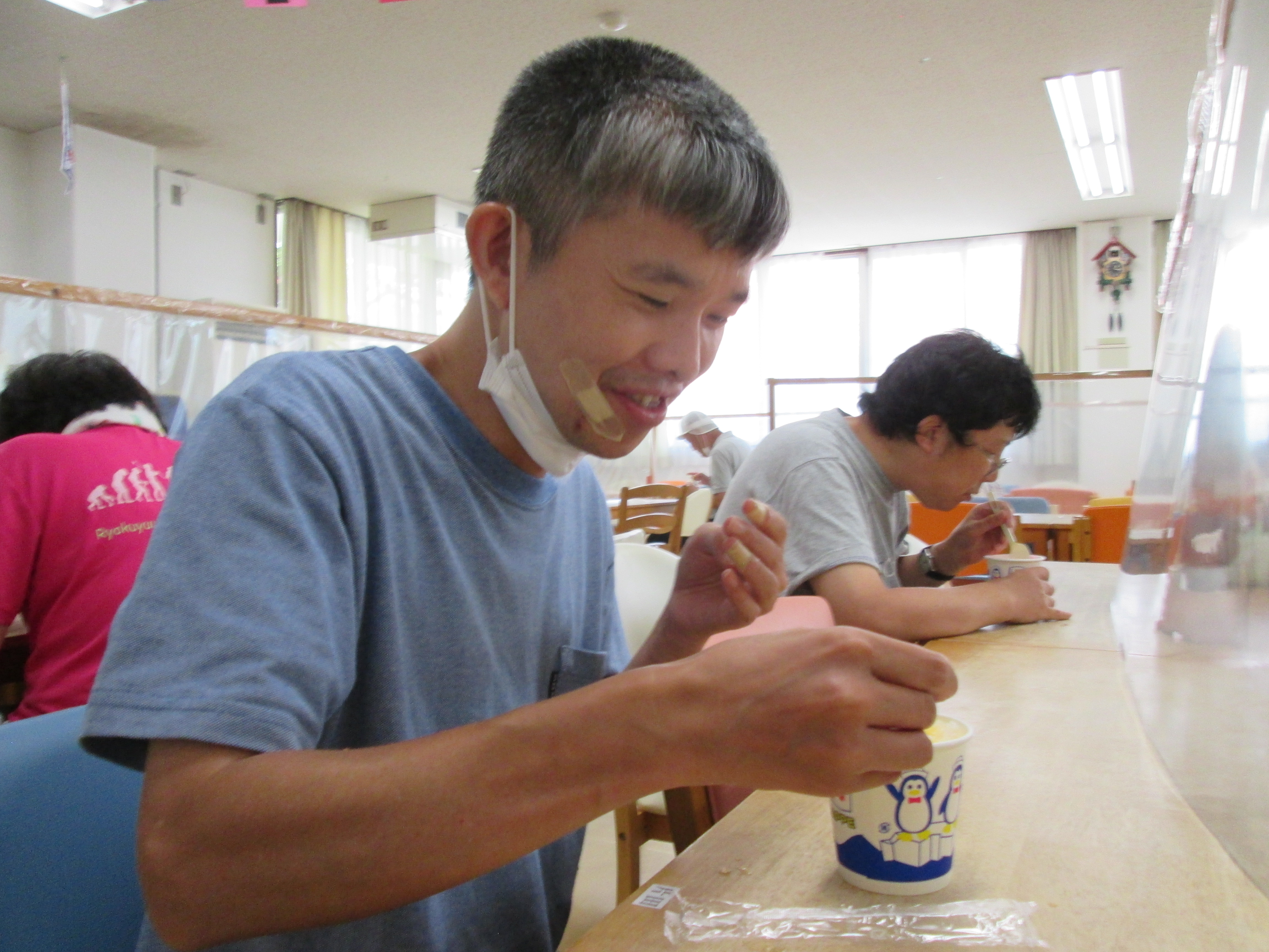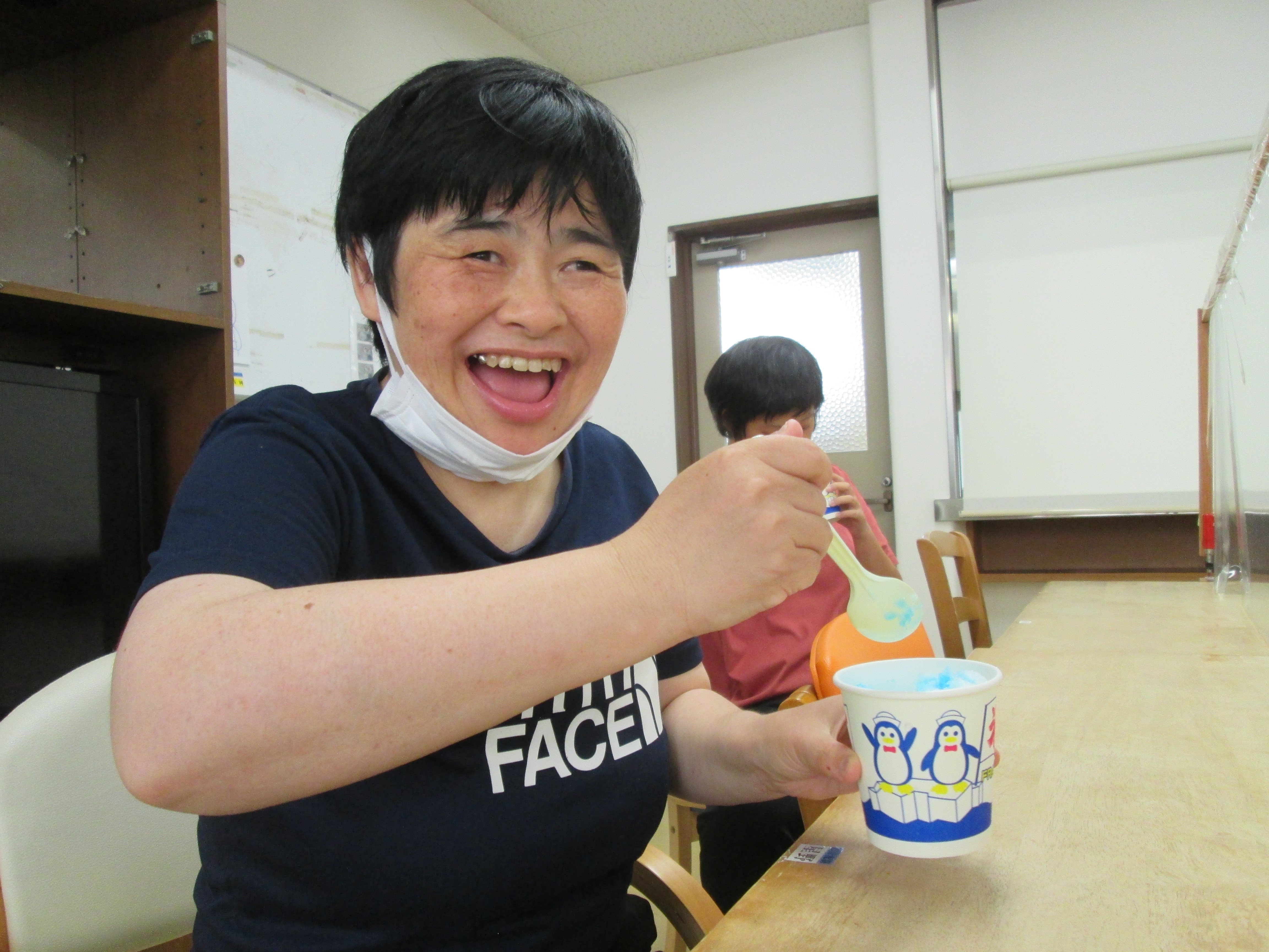 かき氷のシロップはいちごやマンゴー、ブルーハワイなど各自好きなシロップを選んでチケットを持って食堂へGO!暑い日に冷たいかき氷をみなさんおいしくいただきました。