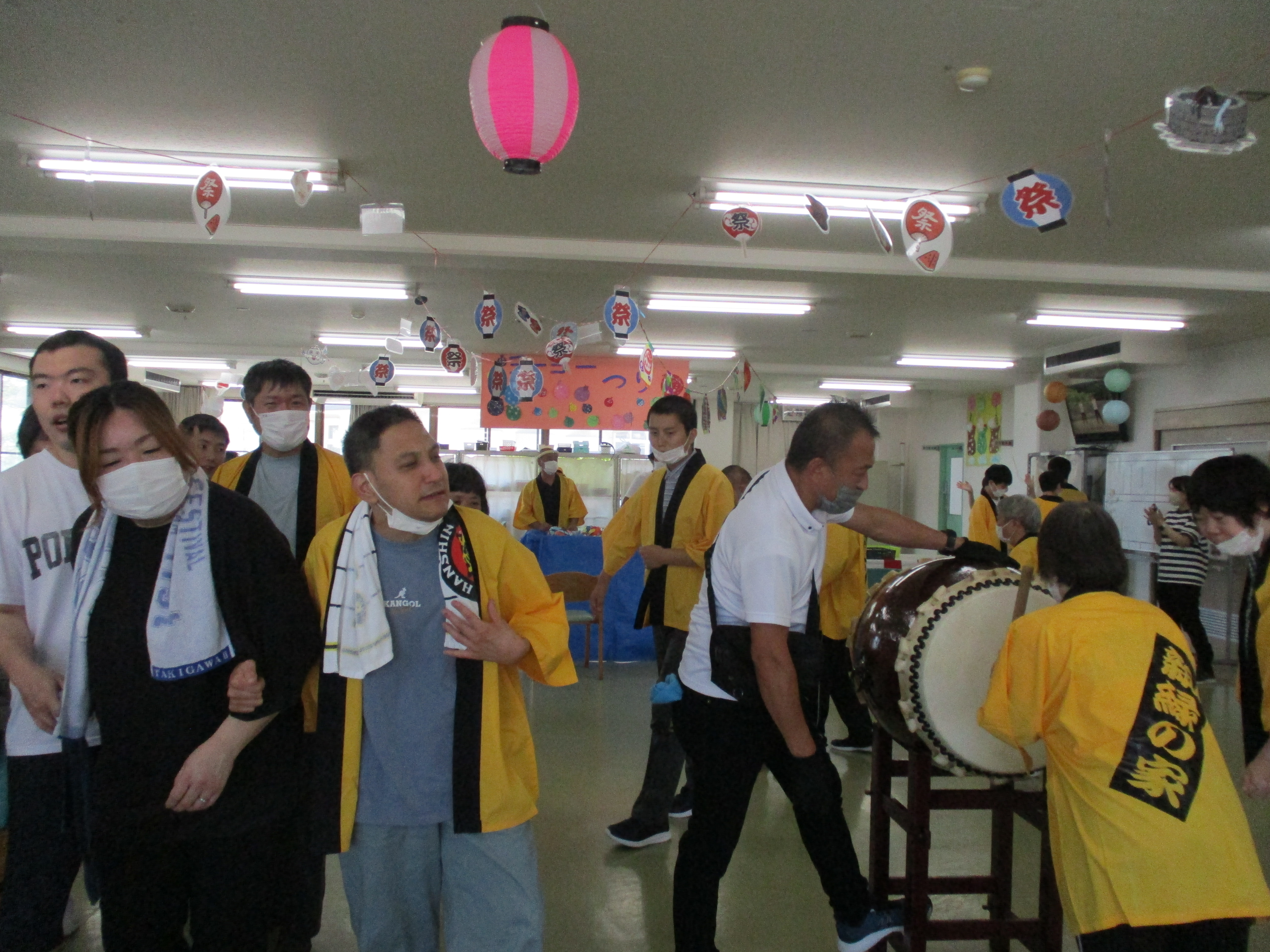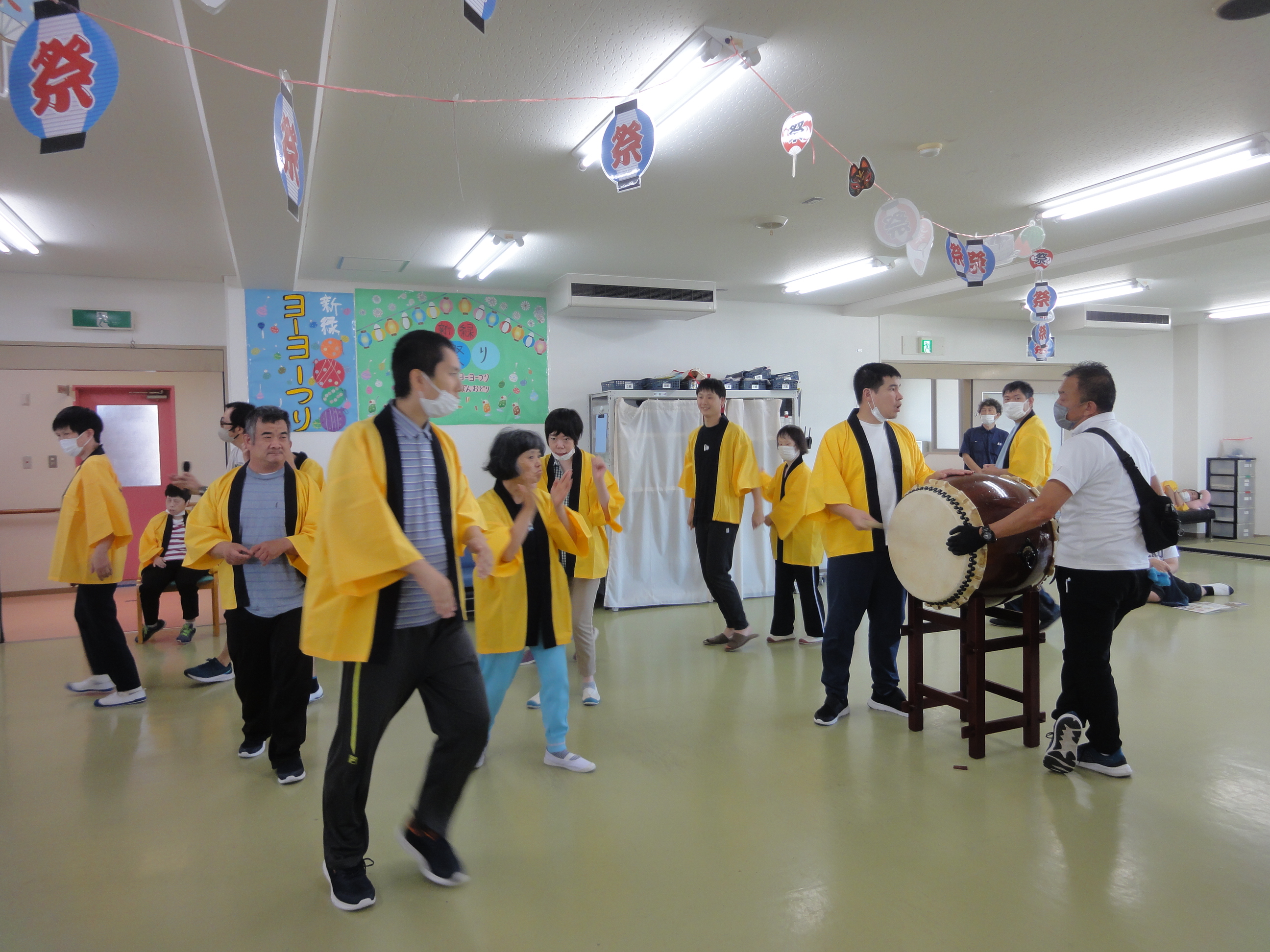 利用者の皆さんは黄色の法被を着て太鼓を叩き、盆踊りを踊りました。