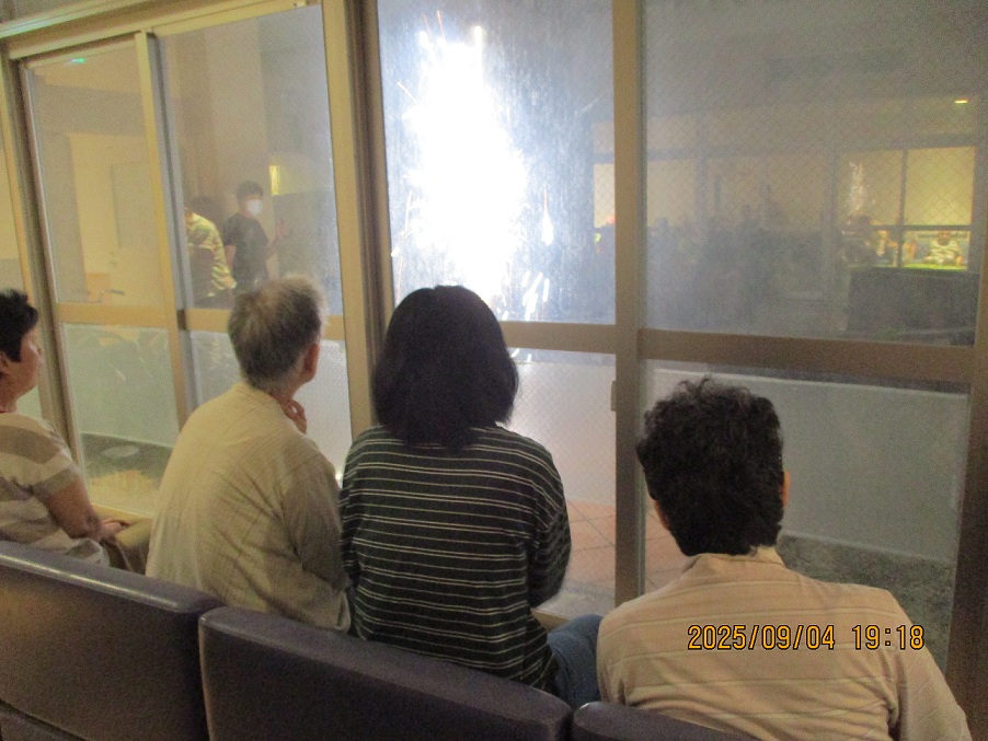 9月の始めには夏の締めくくりとして花火大会を行いました。あいにくの雨でしたがそれに負けない花火の輝きに皆さん大盛り上がりでした。 ');