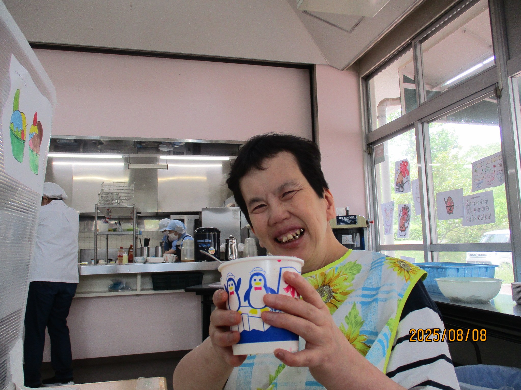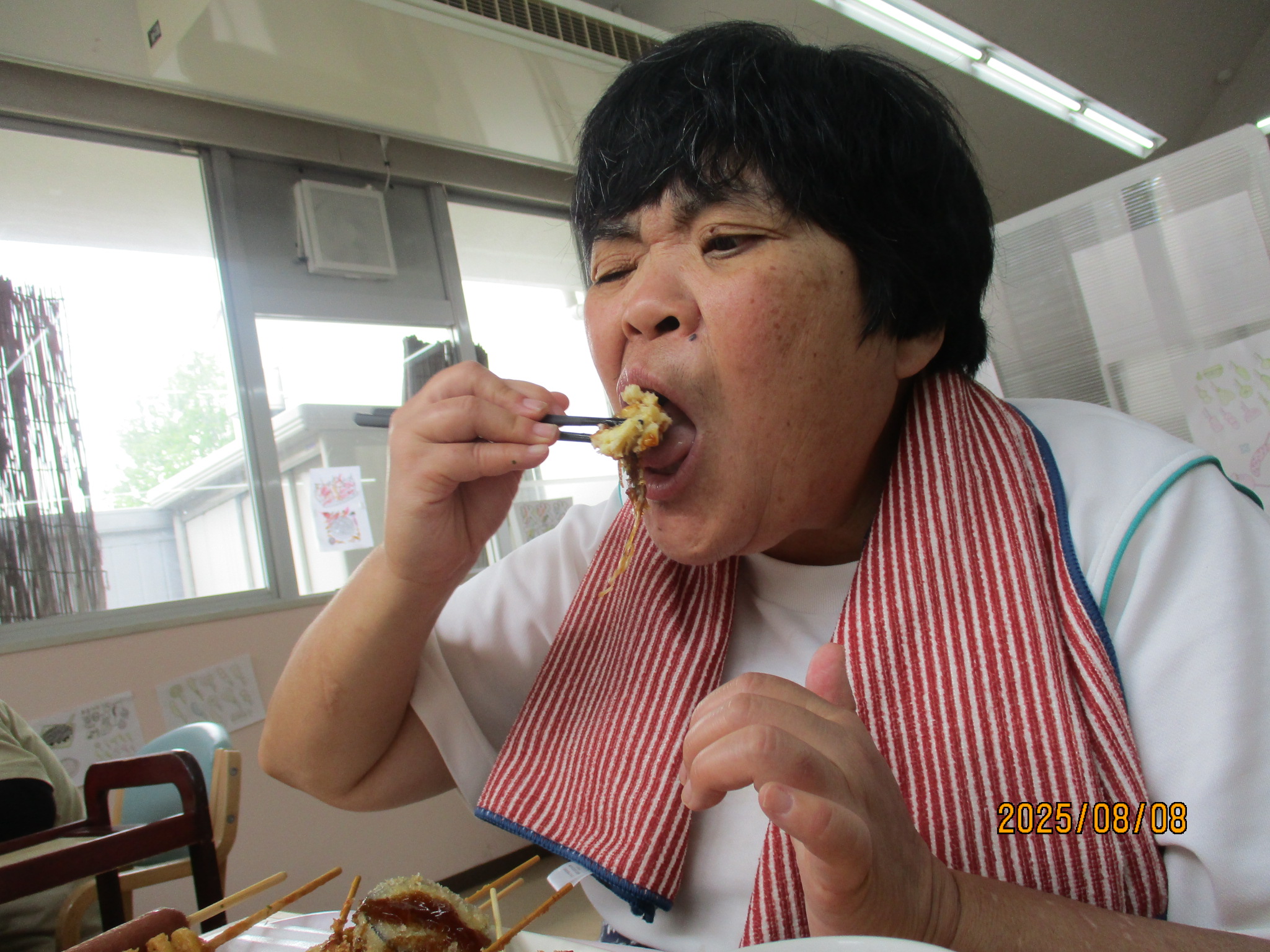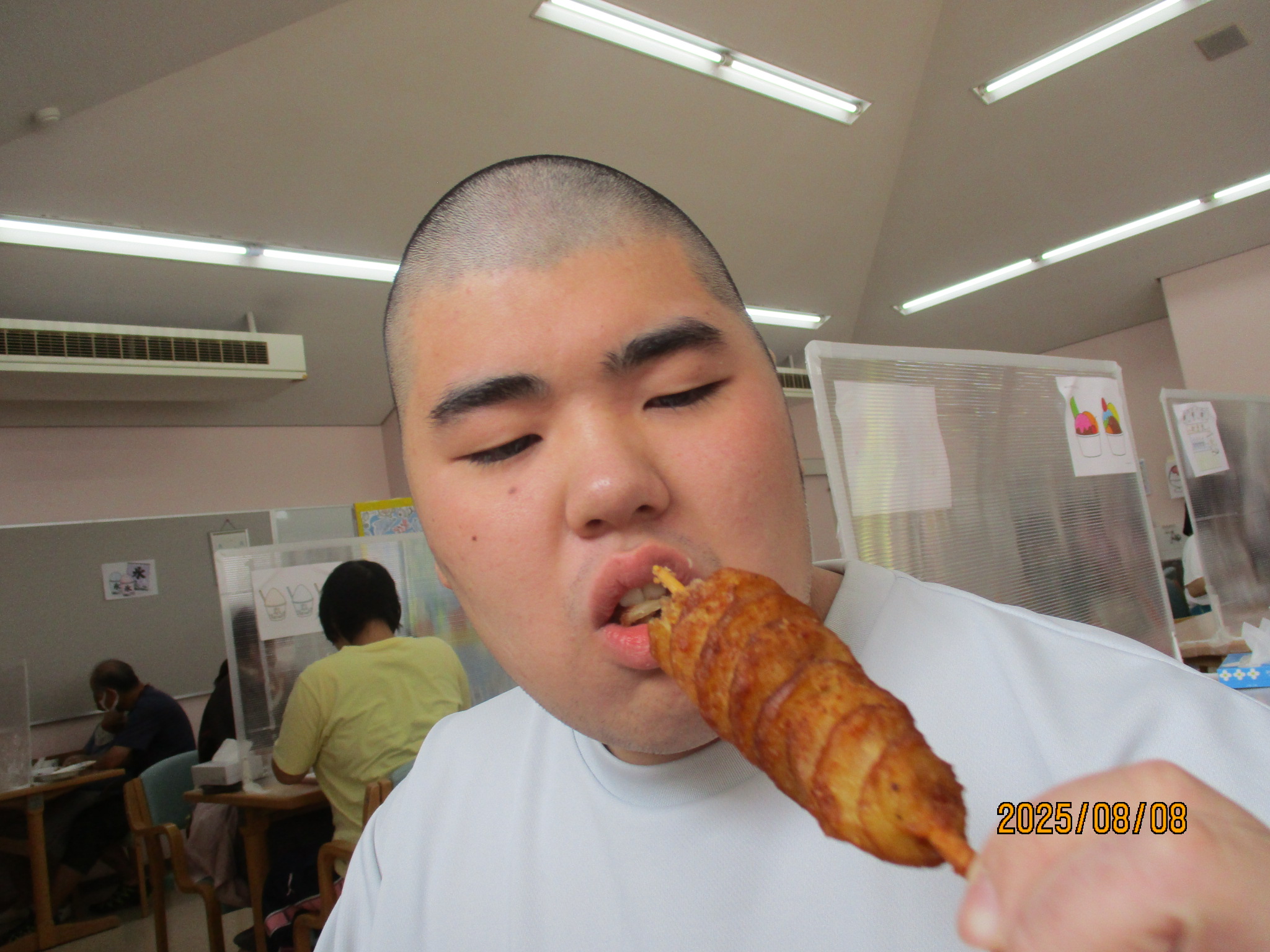 2025年08月18日 屋台給食!! 令和7年8月8日(金)は、屋台給食でした。色とりどりのメニュー。 お好み焼き、串カツ、フランクフルト、ハリケーンポテト、ジュース、かき氷でした。 たくさん食べてお腹もいっぱいになり、夏の暑さに負けないエネルギーを補給できました♪♪