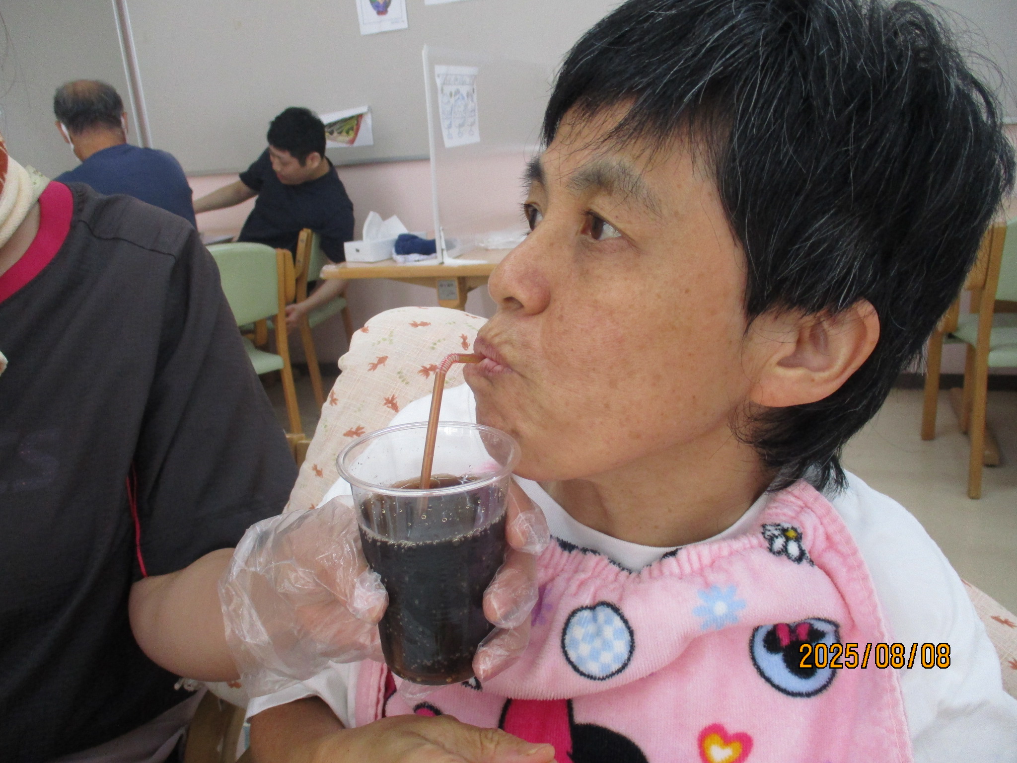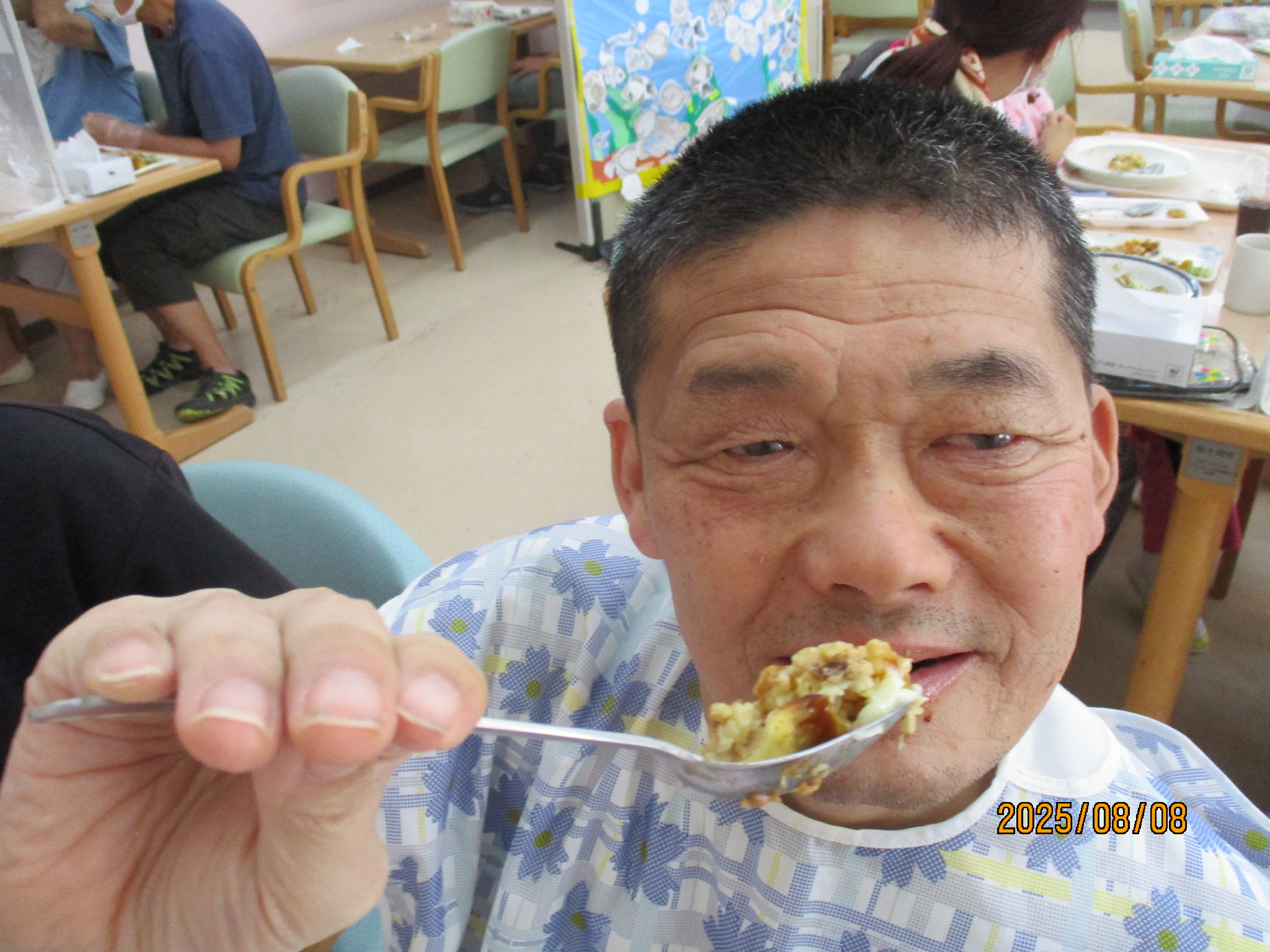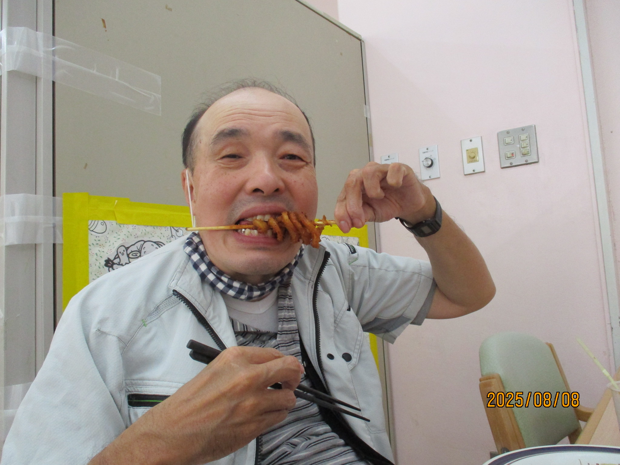 2025年08月18日 屋台給食!! 令和7年8月8日(金)は、屋台給食でした。色とりどりのメニュー。 お好み焼き、串カツ、フランクフルト、ハリケーンポテト、ジュース、かき氷でした。 たくさん食べてお腹もいっぱいになり、夏の暑さに負けないエネルギーを補給できました♪♪