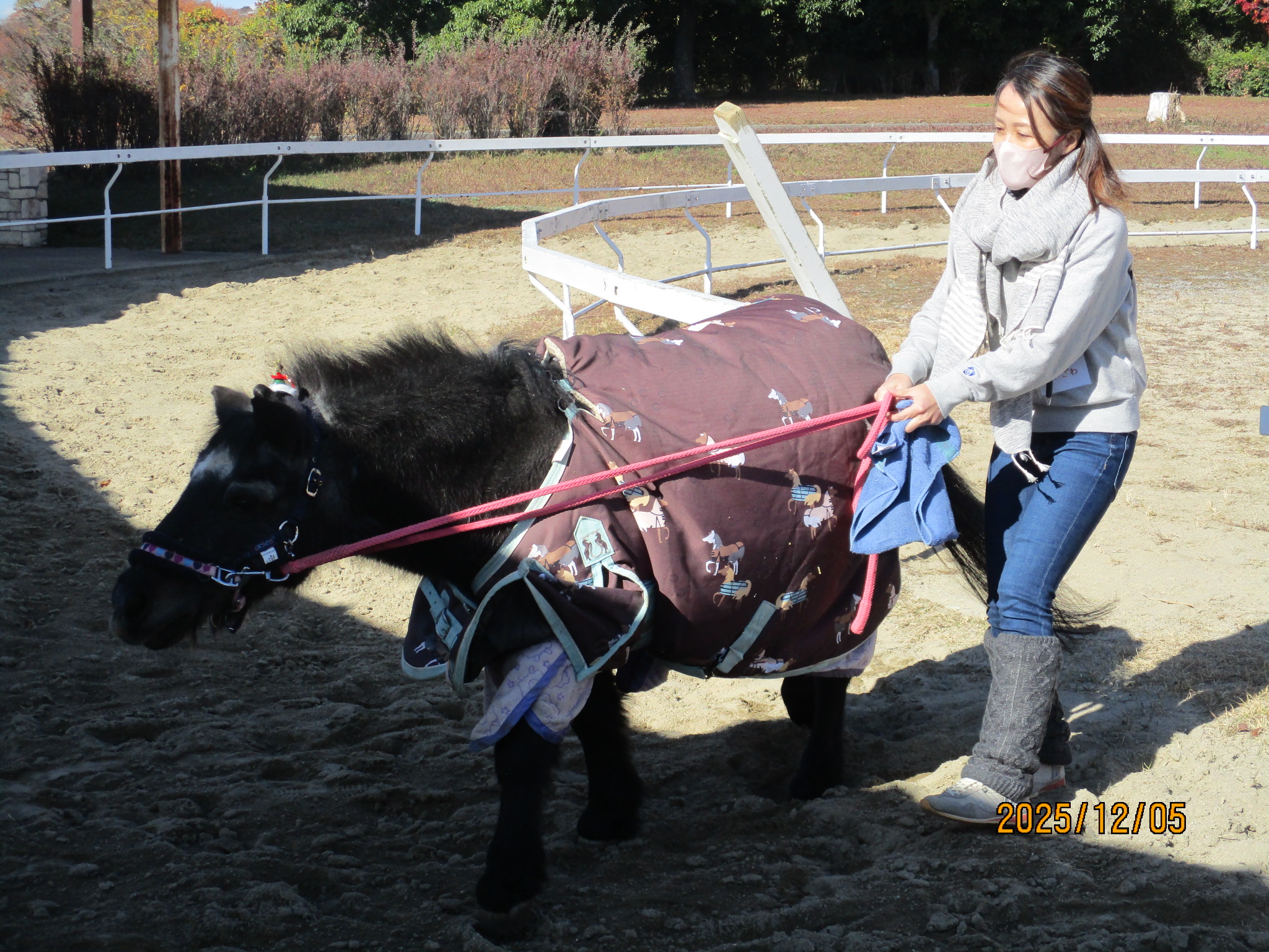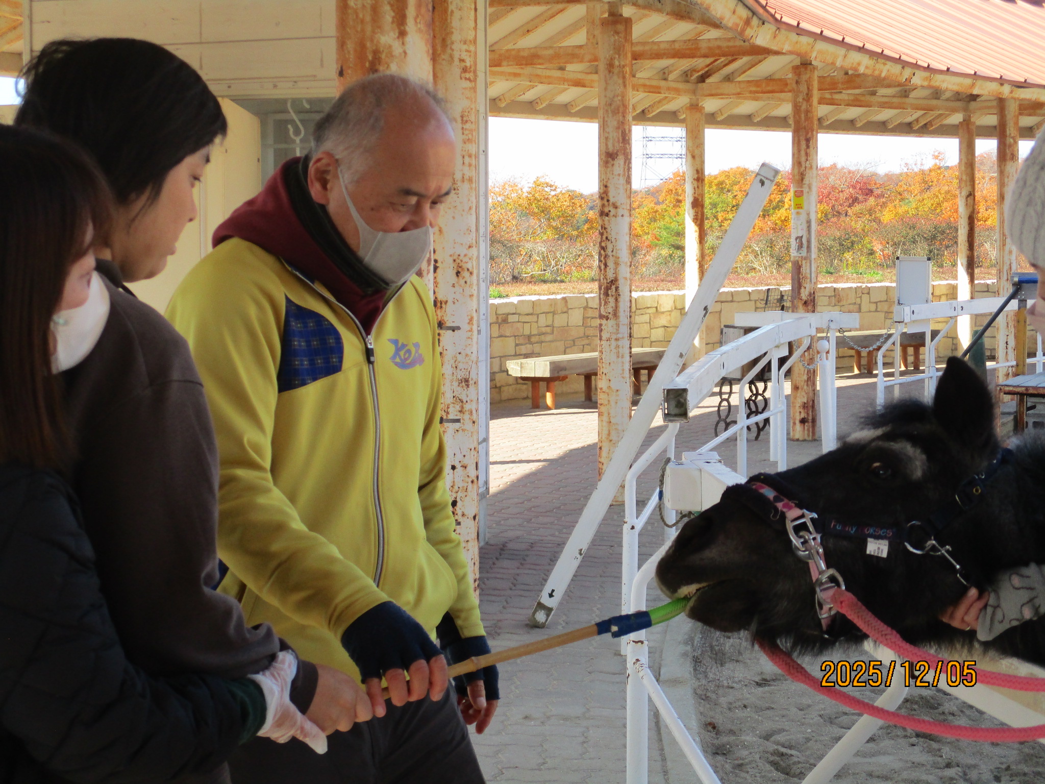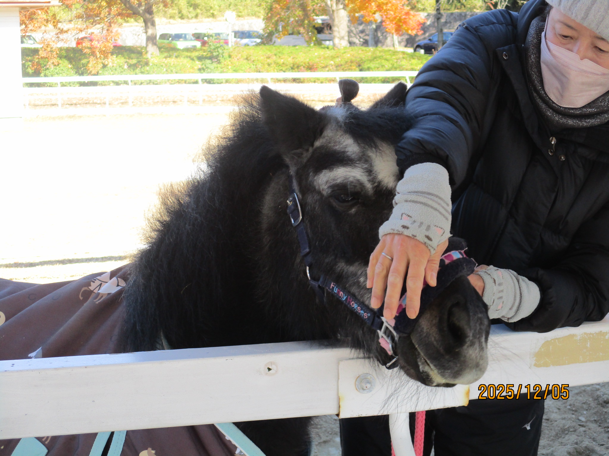 毎年恒例、農園で収穫したニンジンをポニーのクロスケに食べてもらいました。今年のニンジンは上出来で、さぞかしクロちゃんも喜ぶと思いきや、高齢で、小刻みのニンジンしか食べられないそうでした。そこで小さくカットして、棒の先につけて食べて貰いました。準備の段階からクロちゃんは、エサに向かって猛ダッシュ!鼻先にニンジンを近寄せると、パクリと大きな口を開け、モグモグ嬉しそうに食べてくれました。